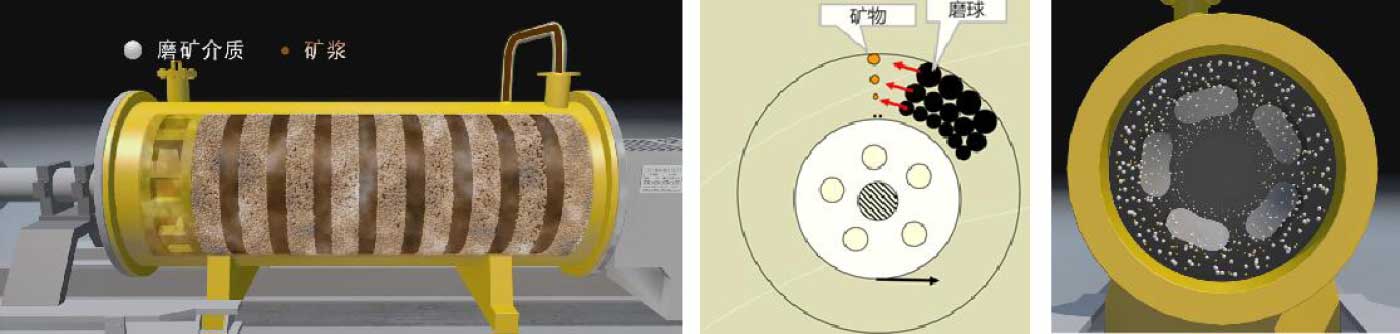 艾砂磨主要是由一個充填了研磨介質(zhì)的研磨筒和一個旋轉(zhuǎn)攪拌器構(gòu)成,旋轉(zhuǎn)攪拌器設(shè)有8個攪拌盤和一個產(chǎn)品分離器。攪拌盤之間形成8個獨立的磨礦腔室,磨礦介質(zhì)在每個磨腔室內(nèi)形成循環(huán),因此形成多段磨礦,攪拌軸高速旋轉(zhuǎn)攪動研磨介質(zhì),產(chǎn)生沖擊、剪切和摩擦作用使物料實現(xiàn)超細粉碎。在高速旋轉(zhuǎn)的離心力作用下,礦物和磨礦介質(zhì)都按粒徑從小到大由磨機軸向筒體內(nèi)壁徑向分布,實現(xiàn)“大磨大、小磨小” 的選擇性磨礦。排礦端的產(chǎn)品分離器,具有內(nèi)部分級功能,將合格產(chǎn)品排出磨機,而將介質(zhì)和粒度未達到要求的顆粒留在磨機中繼續(xù)磨礦,從而實現(xiàn)開路磨礦,而且產(chǎn)品窄粒級分布,簡化了生產(chǎn)流程。”