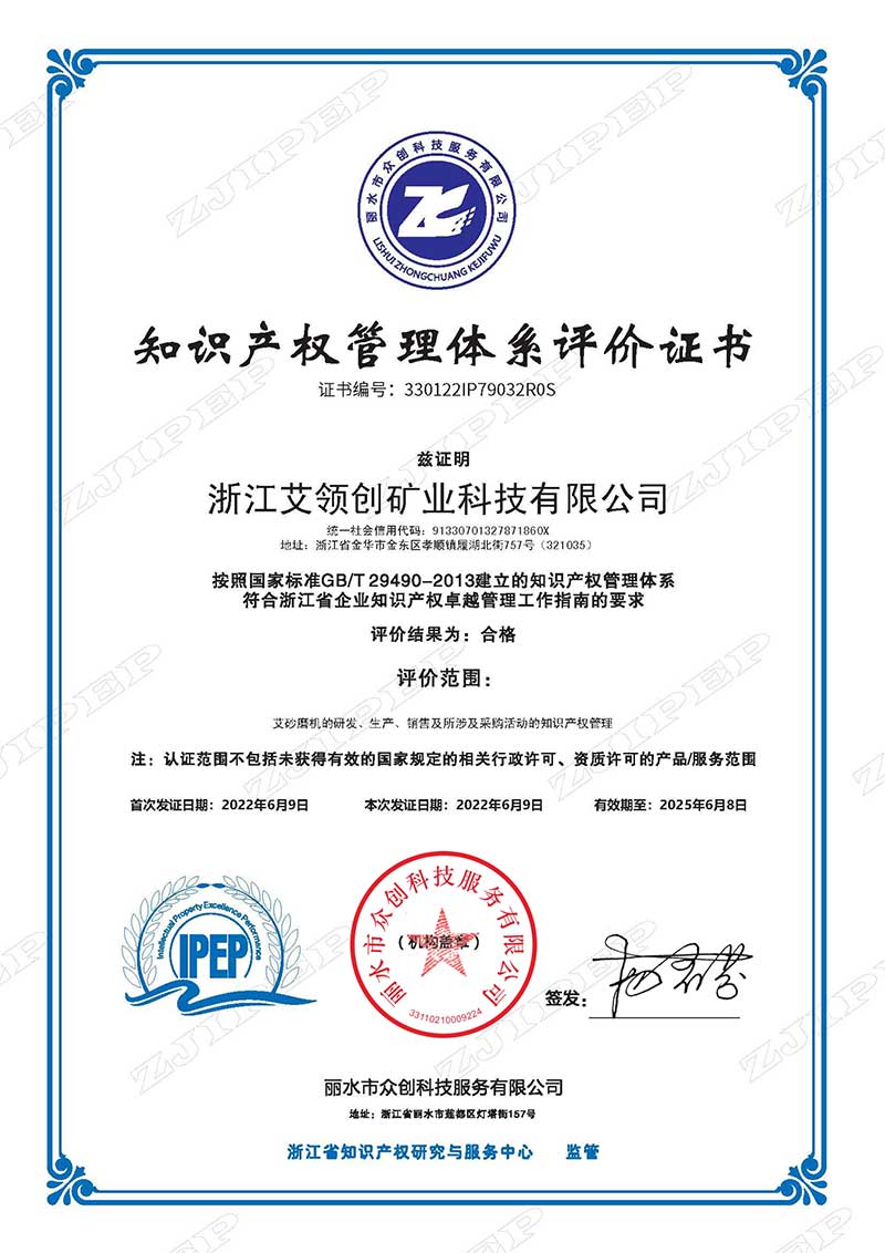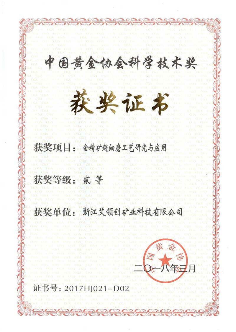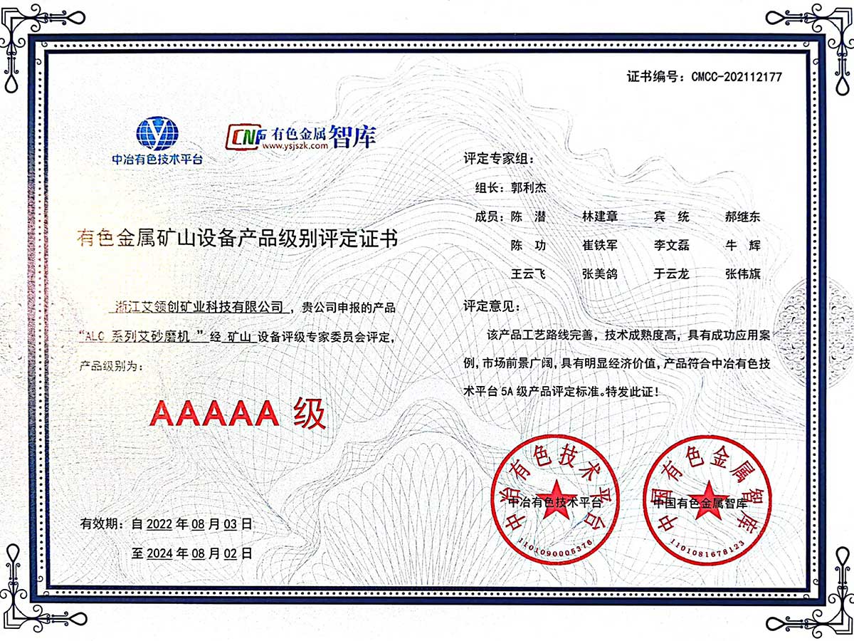 有色金屬礦山設(shè)備產(chǎn)品級別評定證書-艾砂磨機(jī)