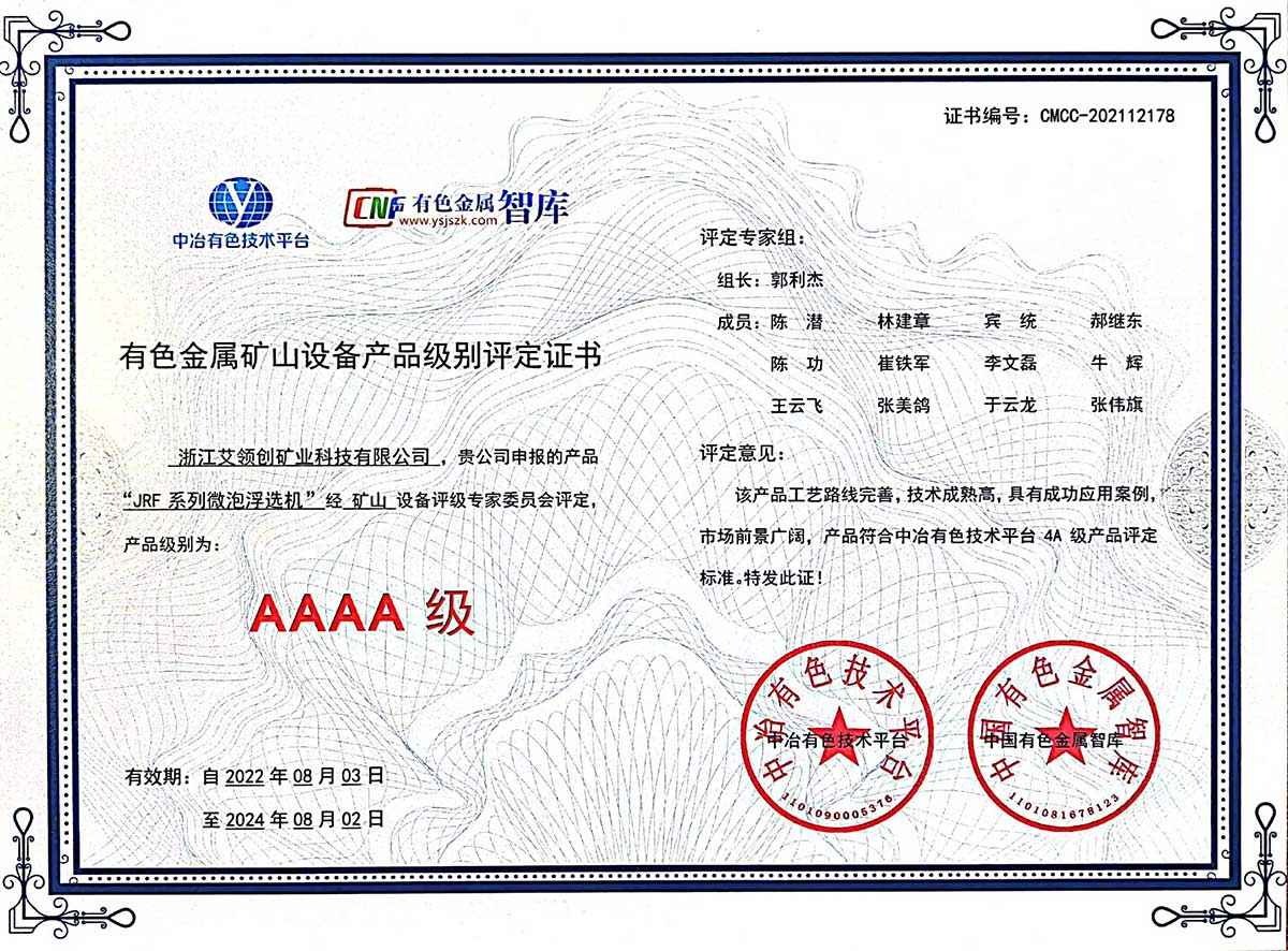 有色金屬礦山設(shè)備產(chǎn)品級別評定證書-浮選機(jī)