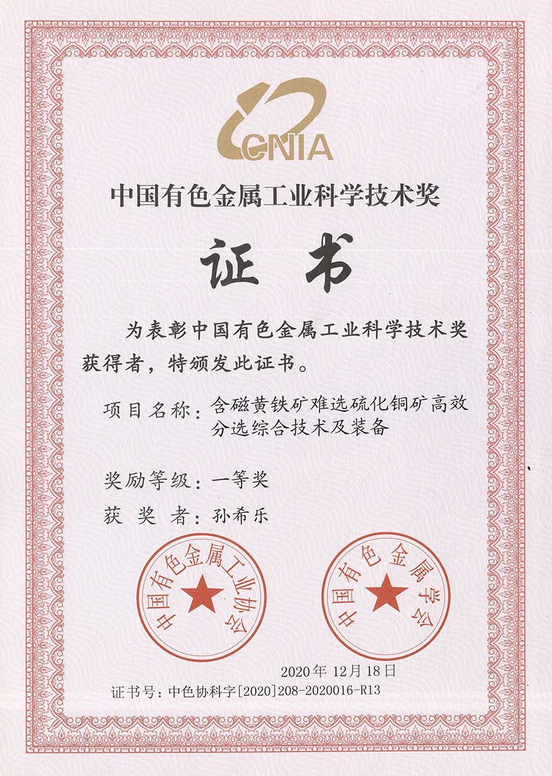 中國有色金屬工業(yè)科學(xué)技術(shù)獎(jiǎng)個(gè)人一等獎(jiǎng)-孫希樂